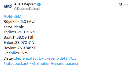 3. Akdeniz’de bir deprem daha