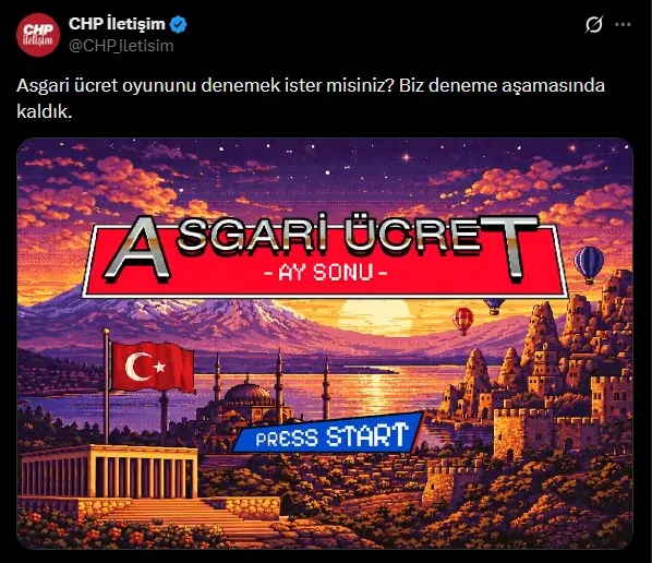 CHP, yaptığı retro stil oyunla milyonlarca taban ücretlinin ay sonunu getirme gayretini ele aldı. Kira, fatura ve market masraflar "canavar" olarak resmedilirken, ay sonu bakiyesi sıfır ile bitti. Oyun sonunda tahlil ise "sandığa git" seçeneğiyle işaret edildi.