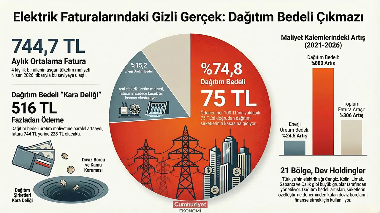 Elektrik Mühendisleri Odası’nın (EMO) hesaplamalarına göre, dağıtım bedeli enerji üretim maliyetleriyle paralel gitmiş olsaydı bugünkü fatura 228 TL seviyesinde olacaktı. Aradaki 516 TL’lik fark ise özelleştirilmiş dağıtım sistemi üzerinden şirketlere aktarılan gelir artışına işaret ediyor. EMO, bu tabloyu “dağıtım bedeli karadeliği” olarak nitelendiriyor.