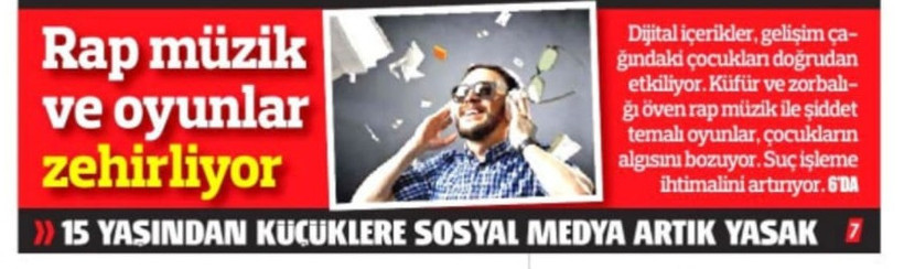 Ardından bugün Türkiye Gazetesi de “Dinleniyor fakat temiz değil: Müzik algıyı direkt etkiler” diyerek rap müziğe işaret etti. Gazete haberinde, “Dizilerde mafya ve zorbalık ‘karizma’ ile sunulurken, kimi rap müziklerinde öfke, husus kullanımı ve aşağılayıcı lisan normalleştiriliyor” diyerek ekranda büyütülenin gerçek hayatta da büyüdüğünü savundu.