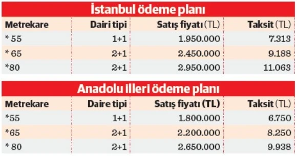 Projede daire büyüklükleri değişiyor. İki farklı büyüklükte 2+1 ve 1+1 daireler mevcut. Ödeme planı da Anadolu ve İstanbul’da farklılık gösteriyor. Peşinat da yüzde 10. Bu kapsamda, Anadolu’da 55 metrekare 1+1 dairede taksit ödemeleri 6.750 TL’den başlarken, peşinatı da 180 bin TL. Yine Anadolu kentlerinde 65 metrekare 2+1 dairede 220 bin TL peşinat, 8.250 TL taksit, 80 metrekare 2+1 dairde 265 bin TL peşinat 9.938 TL taksit ödemesi bulunuyor. İstanbul’da ise 55 metrekare 1+1 dairede peşinat 195 bin TL, taksit ödemeleri 7.313 TL’den başlıyor. Yine 65 metrekare 2+1 dairede 245 bin TL peşinat, 9.188 TL taksit, 80 metrekare 2+1 dairede 295 bin TL peşinat ve 11.063 TL taksit ödemesi kelam konutu. Projede yüzde 10 peşinat olurken, vadeler 240 aya uzuyor. Proje kapsamında İstanbul’da müracaat ve ödeme şartları Anadolu vilayetlerinden farklı tutulurken, hane halkı aylık net geliri İstanbul için en fazla 145 bin TL, öteki vilayetler için 127 bin TL olarak belirlendi.