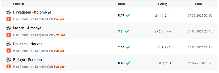 Bir Misli üyesi, Cuma bülteninde yer alan dört karşılaşmaya Maç Sonucu ve Karşılıklı Gol Var tercihleri içeren bir kupon yaptı. Kuponunda yer verdiği maçlardan Bolivya - Surinam karşılaşması Dünya Kupası Elemeleri Play- off, Hollanda - Norveç, İsviçre - Almanya ve Hırvatistan - Kolombiya ise hazırlık maçlarıydı. Dört karşılaşma için de ‘’Maç Sonucu ve Karşılıklı Gol Olur’’ yönünde tercih yapan Misli üyesi 461.25 oranlı bir kupon tutturmuş oldu. Yaptığı kupona Misli Arena’da da yer veren üye, diğer Misli üyeleriyle de kuponunu paylaşmış oldu.