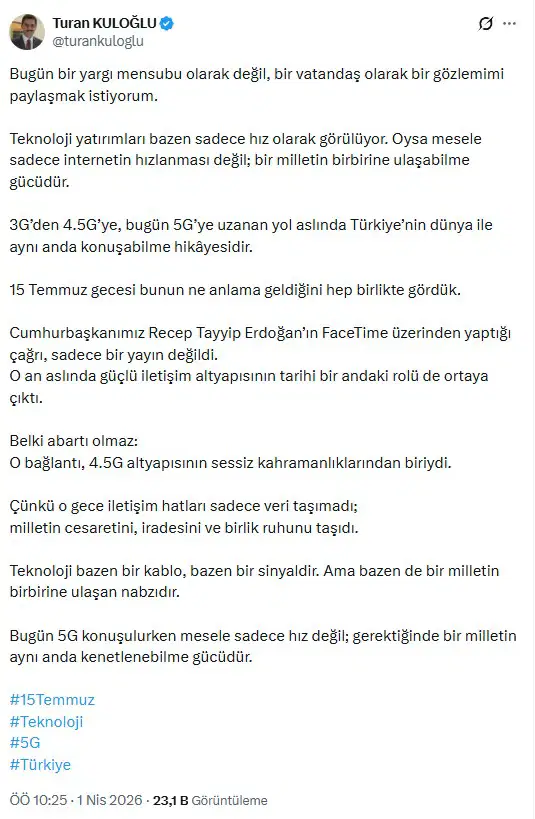HSK Genel Kurul Üyesi Kuloğlu; Çakmak’ın savunması alınırken, sosyal medya hesabından; “Teknoloji yatırımları bazen sadece hız olarak görülüyor. Oysa mesele sadece internetin hızlanması değil; bir milletin birbirine ulaşabilme gücüdür. 15 Temmuz gecesi bunun ne anlama geldiğini hep birlikte gördük. Cumhurbaşkanımız Recep Tayyip Erdoğan’ın FaceTime üzerinden yaptığı çağrı, sadece bir yayın değildi. Bugün 5G konuşulurken mesele sadece hız değil; gerektiğinde bir milletin aynı anda kenetlenebilme gücüdür” paylaşımında bulundu.