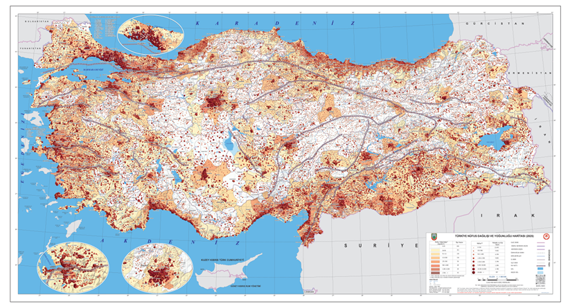 1/1.000.000 ölçekli Türkiye Nüfus Dağılışı ve Yoğunluğu Haritası (2025) güncellendi.