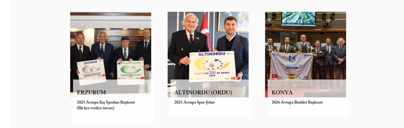 Organizasyonun web sitesinde yer alan bilgiye nazaran, 2020 yılında Çorlu, 2021 yılında Nevşehir ve Çiğli, 2023 yılında Sakarya, 2024 yılında Kayseri, 2025 yılında Altınordu (Ordu), 2026 yılında ise Sultangazi, Avrupa Spor Kenti ilan edildi.