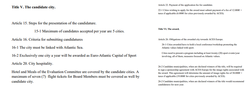 ACES Europe – Avrupa Atlantik Spor Başşehri genel yönetmeliğinde ise müracaat fiyatlarıyla ilgili şu sözler yer alıyor: