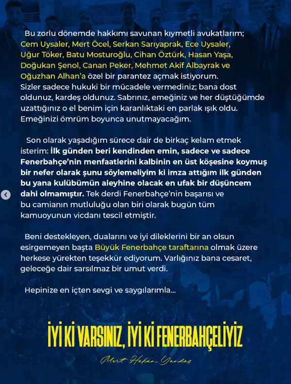 Beni destekleyen, dualarını ve iyi dileklerini bir an olsun esirgemeyen başta Büyük Fenerbahçe taraftarına olmak üzere herkese yürekten teşekkür ediyorum. Varlığınız bana cesaret, geleceğe dair sarsılmaz bir umut verdi.