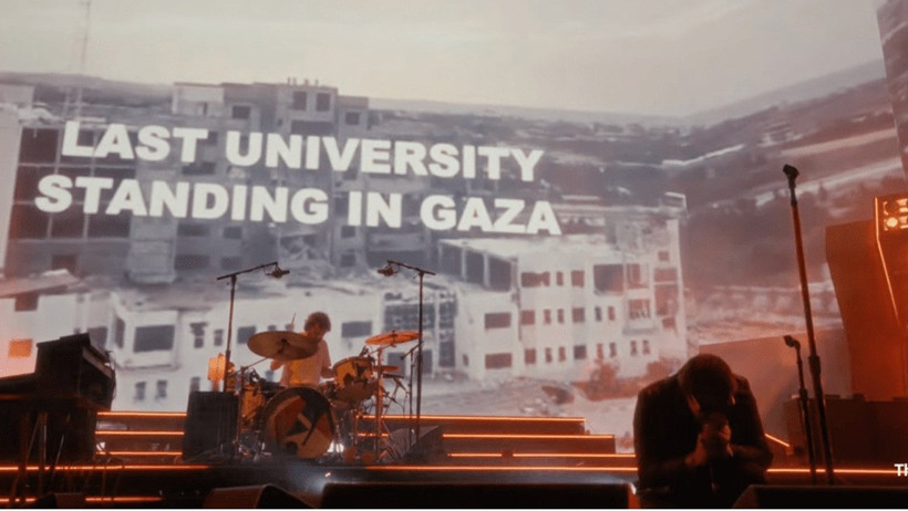 Grup, hafta sonunun ikinci gününde sahneye çıktığı konserde 2016’dan beri canlı çalmadığı “Oblivius” modülünü seslendirirken sahne ardındaki dev LED ekranlarda politik bir görüntü kolajı yayınladı. Manzaralarda ABD’nin dış müdahaleleri, rejim değişiklikleri ve İsrail’in Gazze’ye yönelik bombardımanları peş peşe sıralandı.