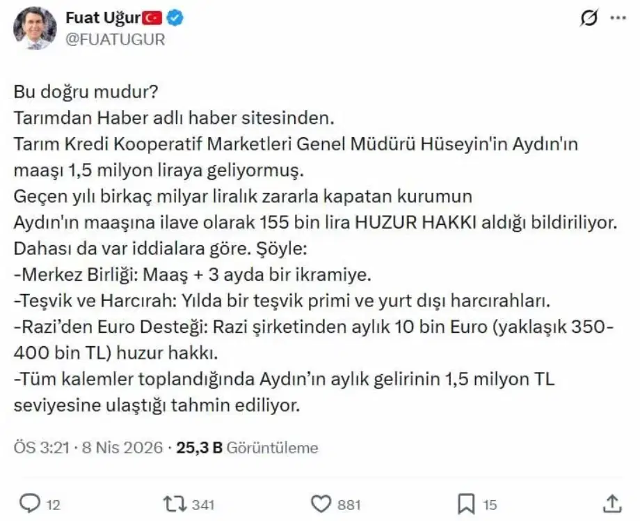 Uğur, sosyal medya hesabından Tarım Kredi Genel Müdürü Hüseyin Aydın’ın aylık gelir kalemlerini paylaşarak, “Bu doğru mu?” sorusunu yöneltti.