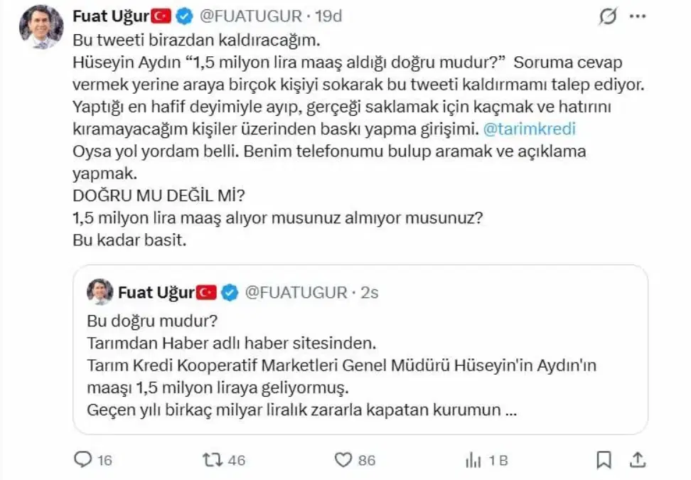 İktidara yakınlığı ile bilinen gazeteci Fuat Uğur, Tarımdan Haber’in gündeme getirdiği “1,5 milyon liralık maaş” iddiasını sordu; ancak açıklama beklerken ‘hatırlı kişilerin’ devreye girmesi üzerine paylaşımlarını kaldırmak zorunda kaldı.